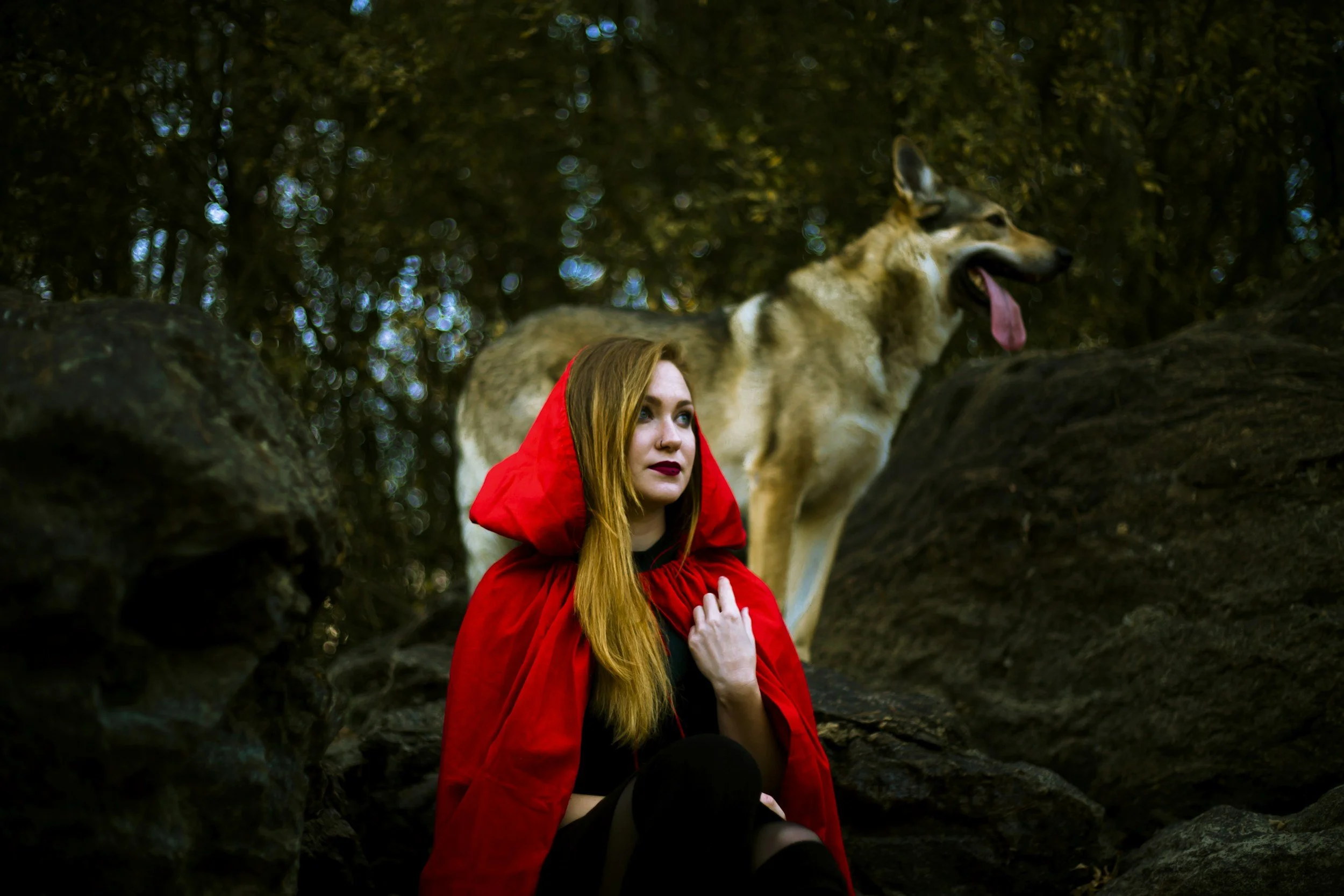The woodcutter rescues good Little Red Riding Hood, who is bringing a gift to her sick grandmother, from the wicked wolf who (again) wants to eat her.