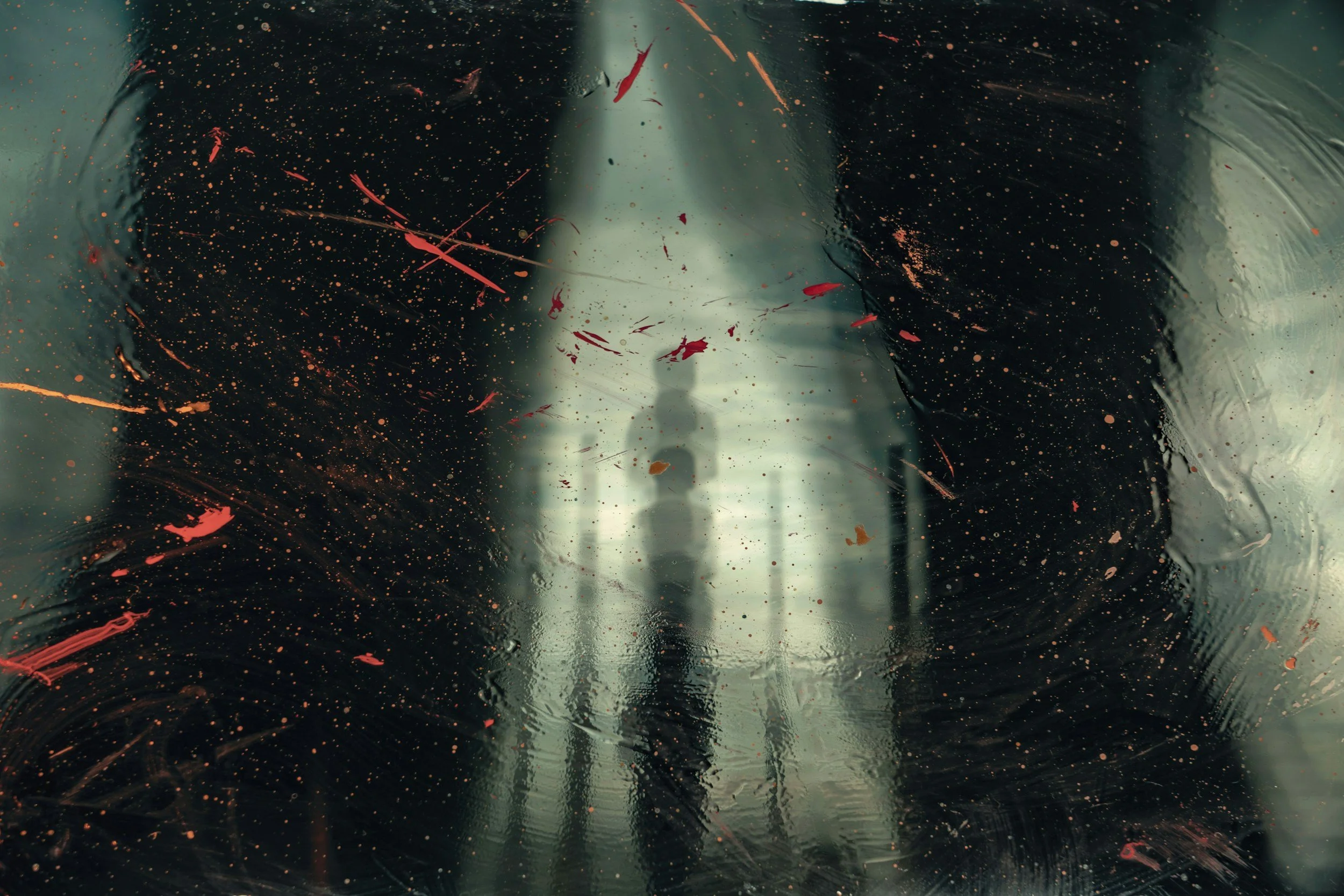 A person walking with an umbrella on a rainy day viewed through a rain-covered window with paint or dirt splatters.