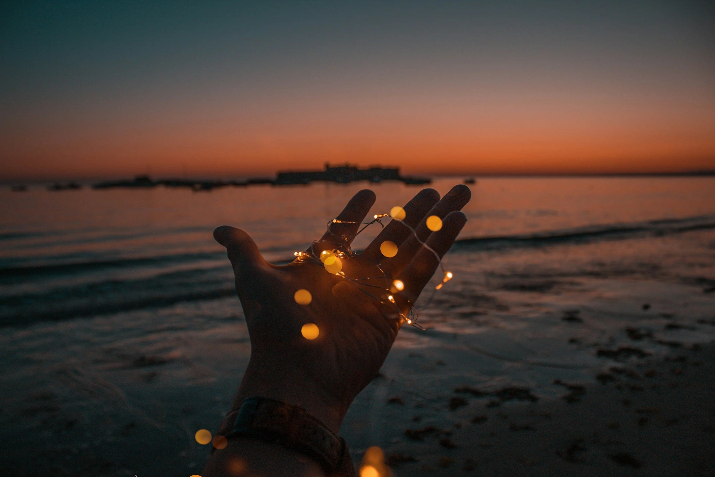 A leafless tree standing on a small hill next to a body of water under a starry night sky with a glowing horizon.