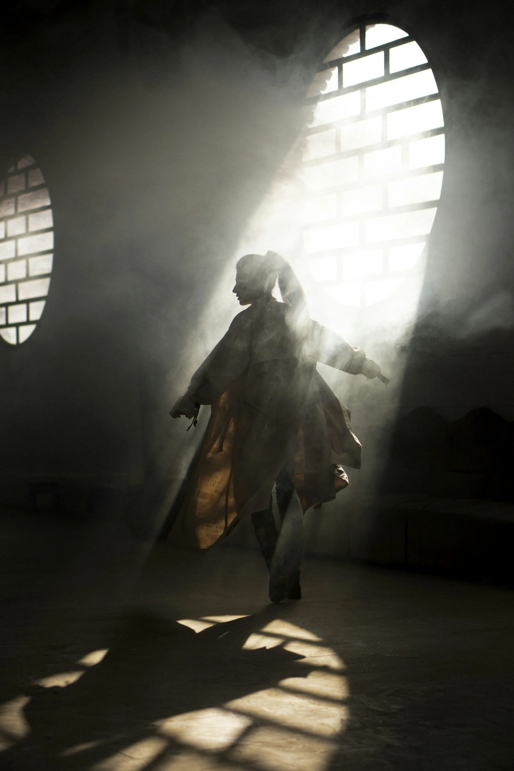 A person walking through a foggy forest with tall trees and dry grass on the ground.